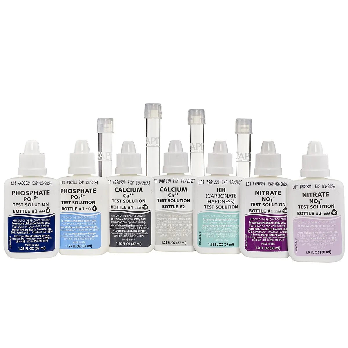The API Reef Master Test Kit tests 4 key parameters – calcium, carbonate hardness, phosphate, and nitrate – to keep reef inhabitants healthy. Testing is fast, easy, and accurate. The kit includes 4 test tubes with snap-tight caps, a holding tub, and a step-by-step instructional booklet with a color chart that provides information on how to correct unsafe water conditions.